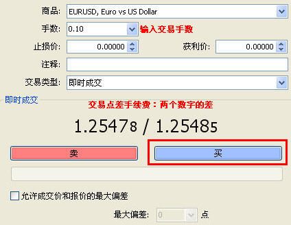 4、输入交易手数,注意可以键盘输入,软件下拉中有的是0.05直接到1手,这我们输入0.1,点击买。